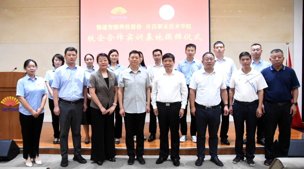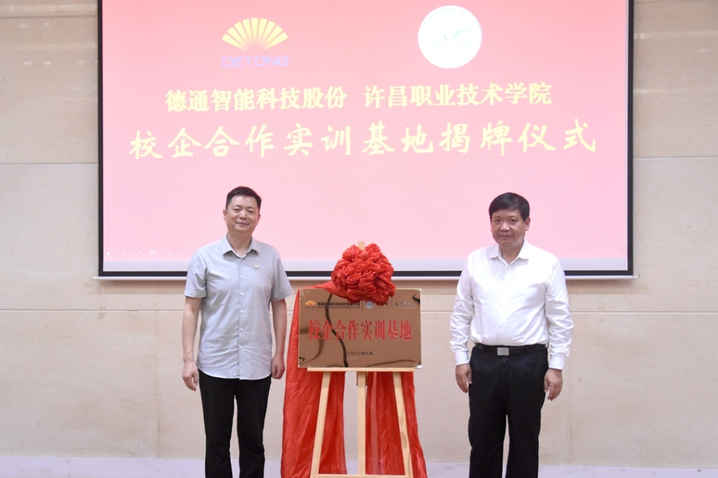9月8日上午,許昌職業(yè)技術(shù)學(xué)院黨委書記尹二軍與德通智能科技股份有限公司董事長張良奇一起,共同為雙方“校企合作實訓(xùn)基地”揭牌。