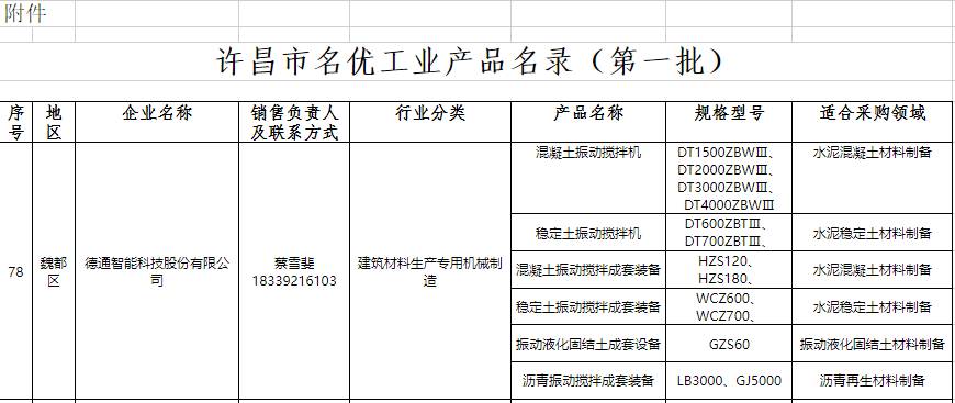 近日,許昌市工業(yè)和信息化局發(fā)布第一批《名優(yōu)工業(yè)產品名錄》,“德通”混凝土振動攪拌機、穩(wěn)定土振動攪拌機、混凝土振動攪拌成套裝備、穩(wěn)定土振動攪拌成套裝備、振動液化固結土成套設備、瀝青振動攪拌成套裝備六大系列產品全部入選。